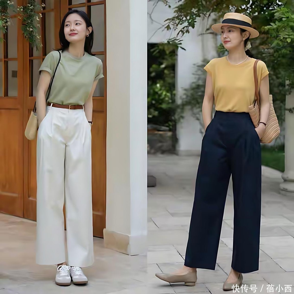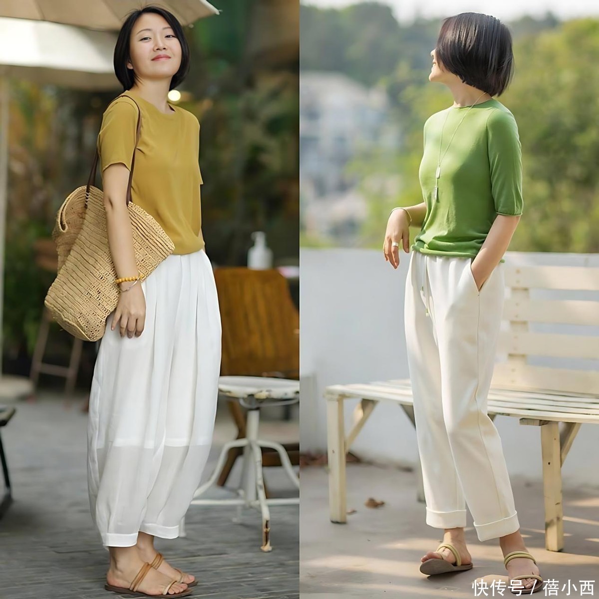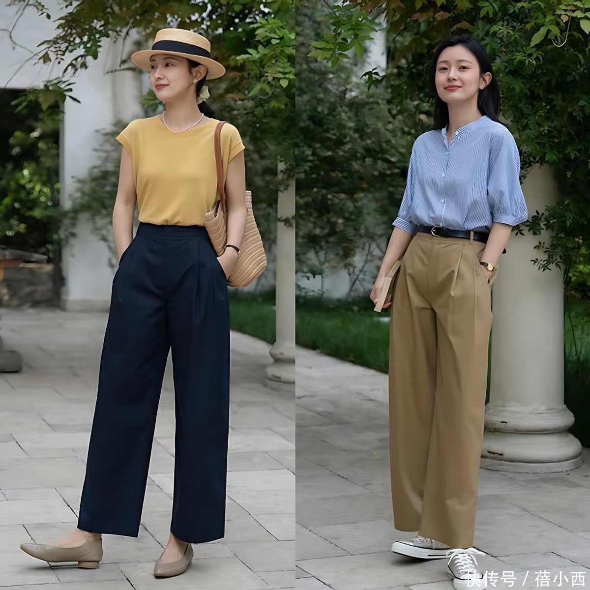 面料的选择上,夏天一定要选透气的。亚麻阔腿裤就很不错,天然的材质自带清凉感,虽然容易起皱,但正是这种“皱皱”的质感,反而多了几分随性自然的味道。