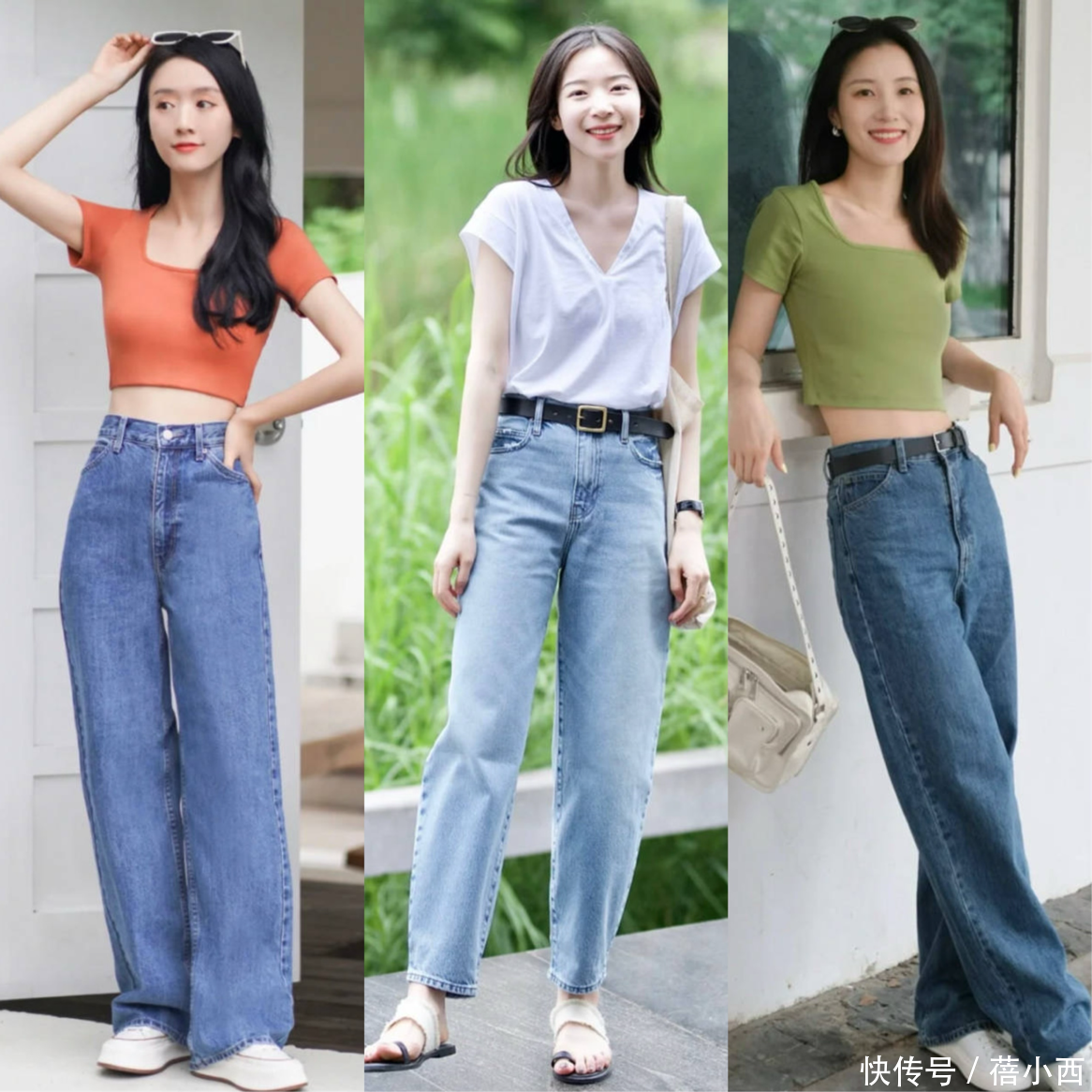 休闲场合中,可以穿牛仔阔腿裤,硬挺的牛仔材质比较有型,穿起来不怕变皱。